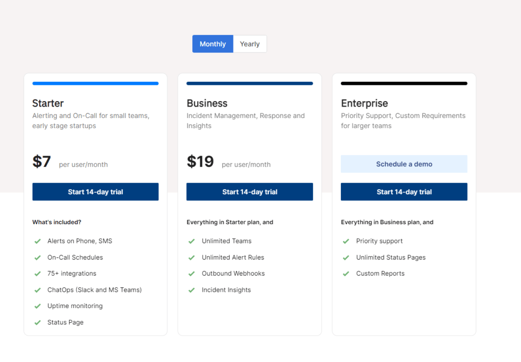 The starter plan is great for small teams or early-stage startups. It includes alerts on phone and SMS, on-call schedules, 75+ integrations, ChatOps, uptime monitoring, and status page.